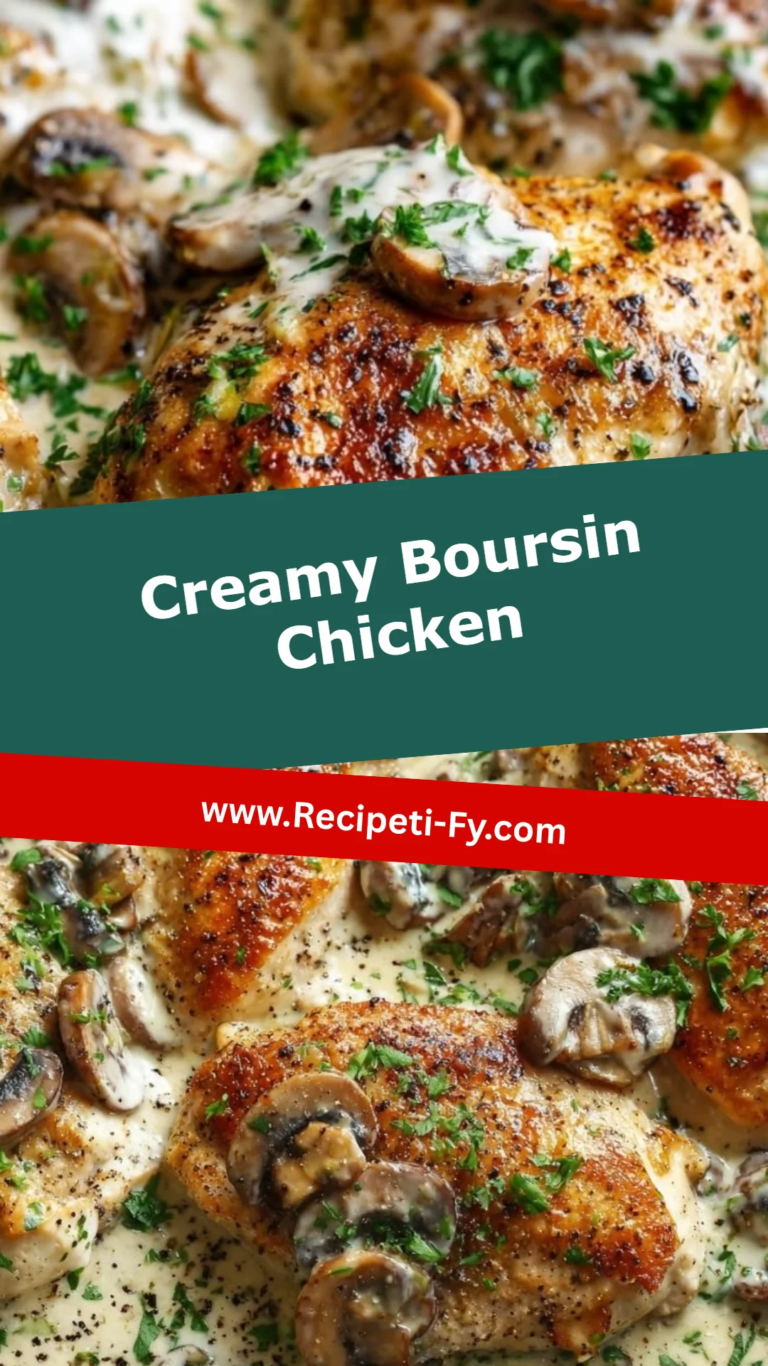Creamy Boursin Chicken is a skillet-cooked chicken breast topped with a silky garlic-and-herb Boursin sauce and sautéed mushrooms. The dish combines tender pan-seared chicken, earthy mushrooms, and a rich, spreadable Boursin cheese that becomes a velvety sauce when melted into chicken broth. Serve this easy, weeknight-friendly meal over pasta, mashed potatoes, or with crusty bread for a satisfying dinner.