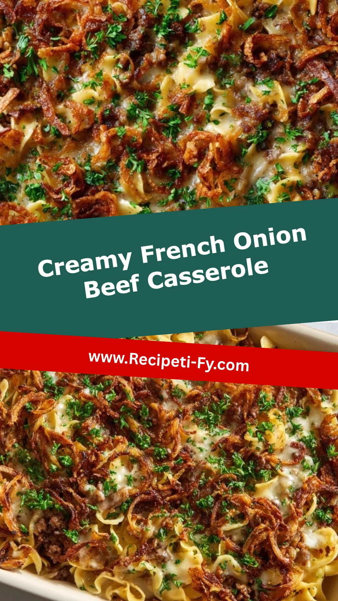 This comforting layered pasta bake features savory browned beef, creamy French onion soup, and tangy sour cream, topped with melted cheddar and crunchy fried onions.